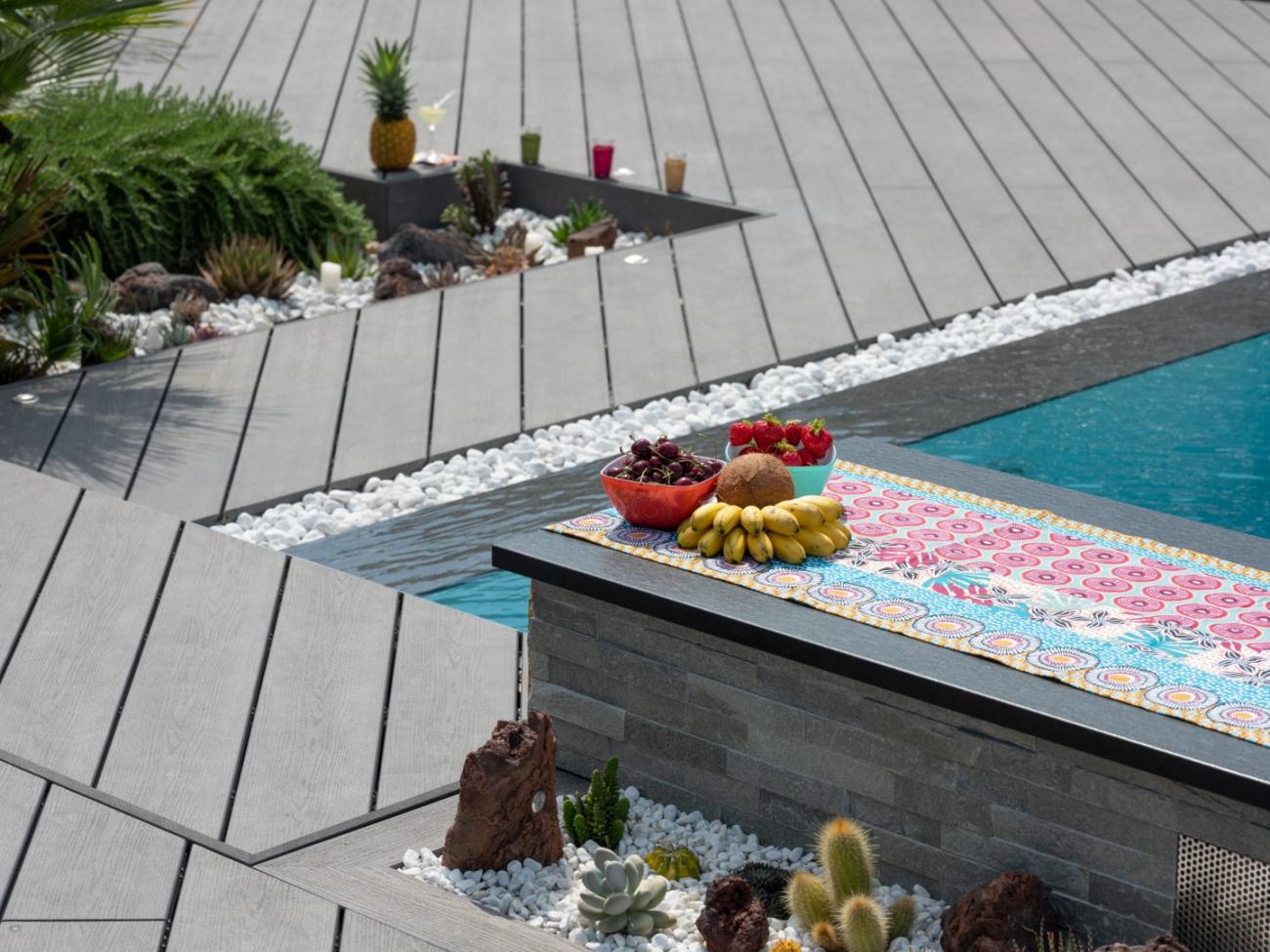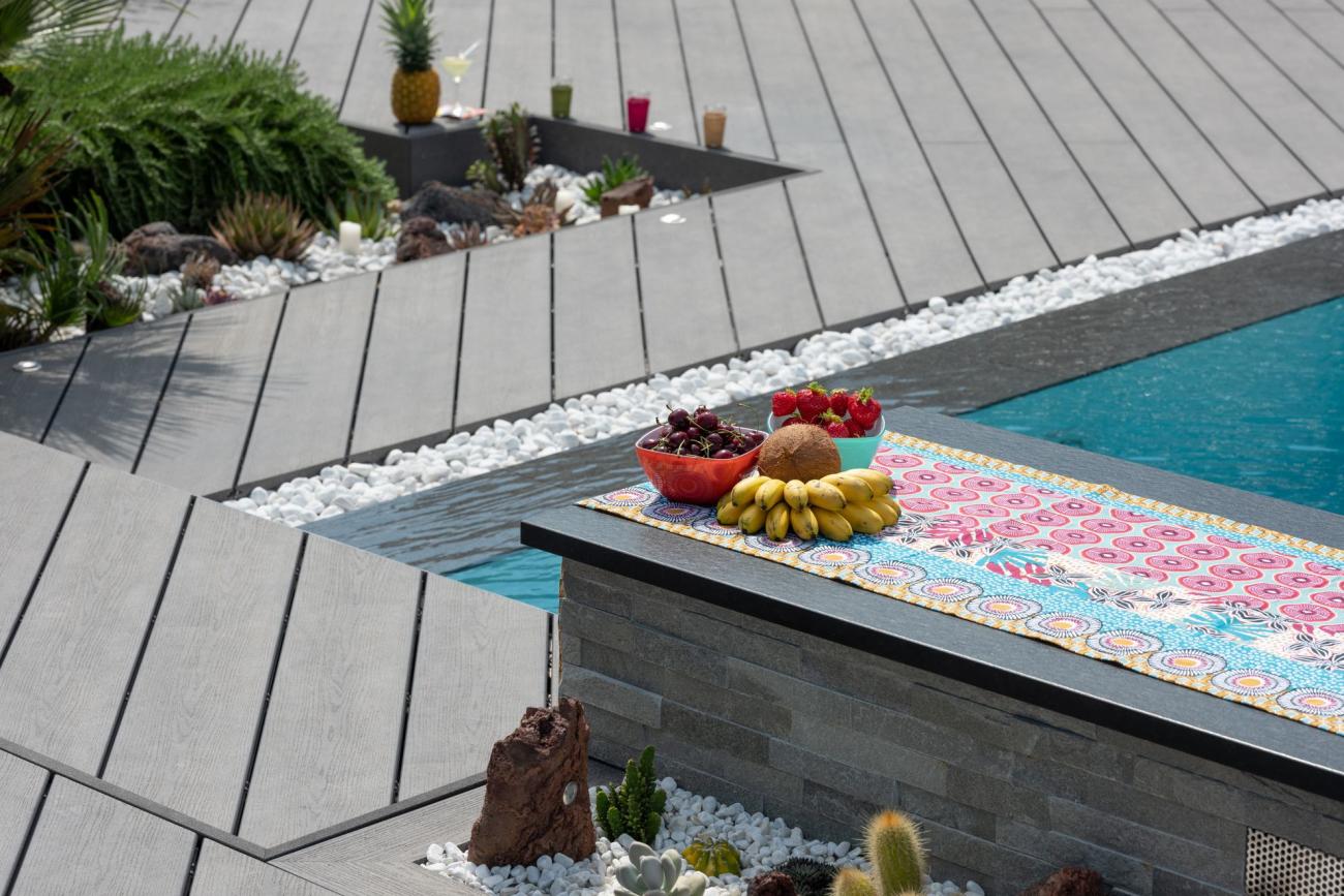 Notre lame structurée est une lame de terrasse composite pleine (non alvéolaire). Il est donc possible de la travailler comme une lame de terrasse bois : laissez parler vos envies pour imaginer votre espace extérieur !
