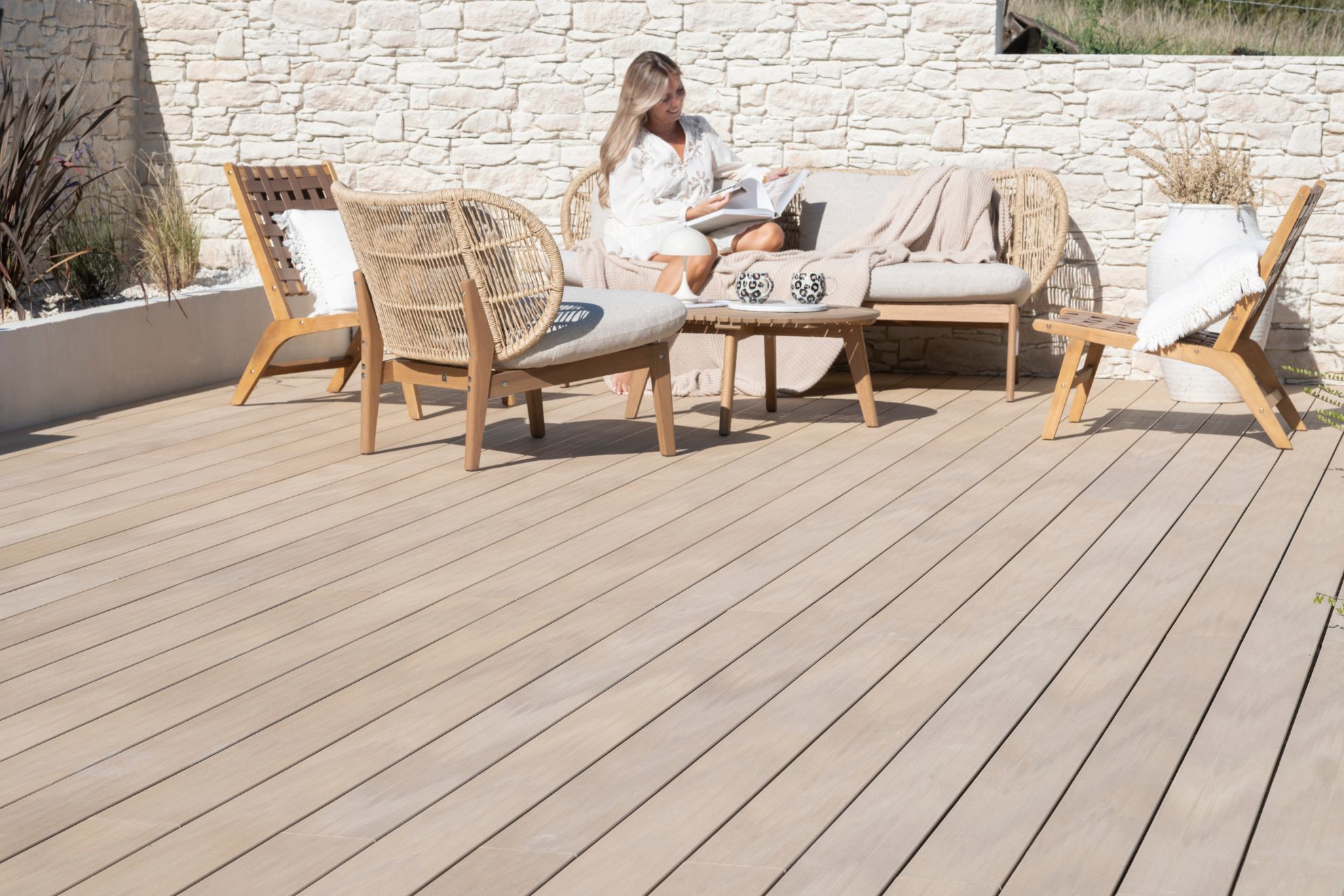 Personnalisez votre terrasse à l’infini, jouez avec les largeurs des lames de terrasse, le sens de pose, réalisez des encadrements pour des effets graphiques personnalisés. Apportez une finition soignée à votre projet avec les jupes et planches de finitions ainsi que les vis assorties au coloris de votre terrasse.