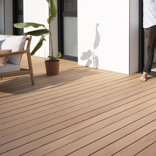 Les lames Élégance et Émotion présentent une structure monoextrudée authentique. Sans enveloppe protectrice, l'aspect bois naturel reste visible et évolue au fil des saisons, nécessitant un entretien périodique adapté. La teinte se patine naturellement avec le temps. L'installation échelonnée, le positionnement de mobilier ou d'éléments décoratifs peut générer des nuances chromatiques entre les différentes zones.