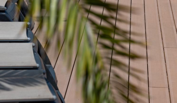 De par sa résistance au poinçonnement et sa durabilité, notre lame de terrasse Élégance rainurée en brun Colorado a su répondre aux attentes du centre commercial avec efficacité. Près de 3 500 m² de lames ont été posées.